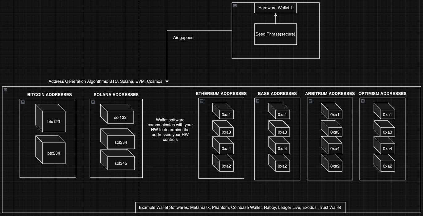 That’s why when you go to Solana, Bitcoin, or Ethereum with the same “hardware wallet” (aka seed phrase) you see totally different addresses. When you go to Ethereum and bridge over to Base you see the same address. Both Base and Ethereum are build with similar technology and basically use the same algorithm for turning private keys into public addresses.
